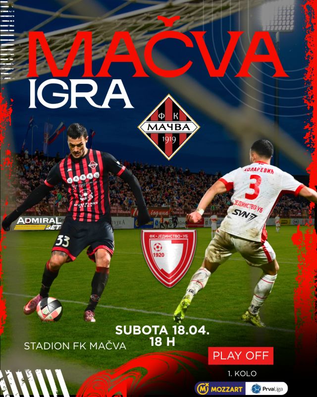 FK MAČVA – FK JEDINSTVO UB - Plej-of – 1. kolo - Subota, 18.04. - 18:00 - Stadion FK Mačva Pred nama je važan korak u borbi za plasman u Super ligu Srbije! Našim momcima je potrebna snažna podrška sa tribina kako bismo zajedno napravili prvi korak ka cilju.