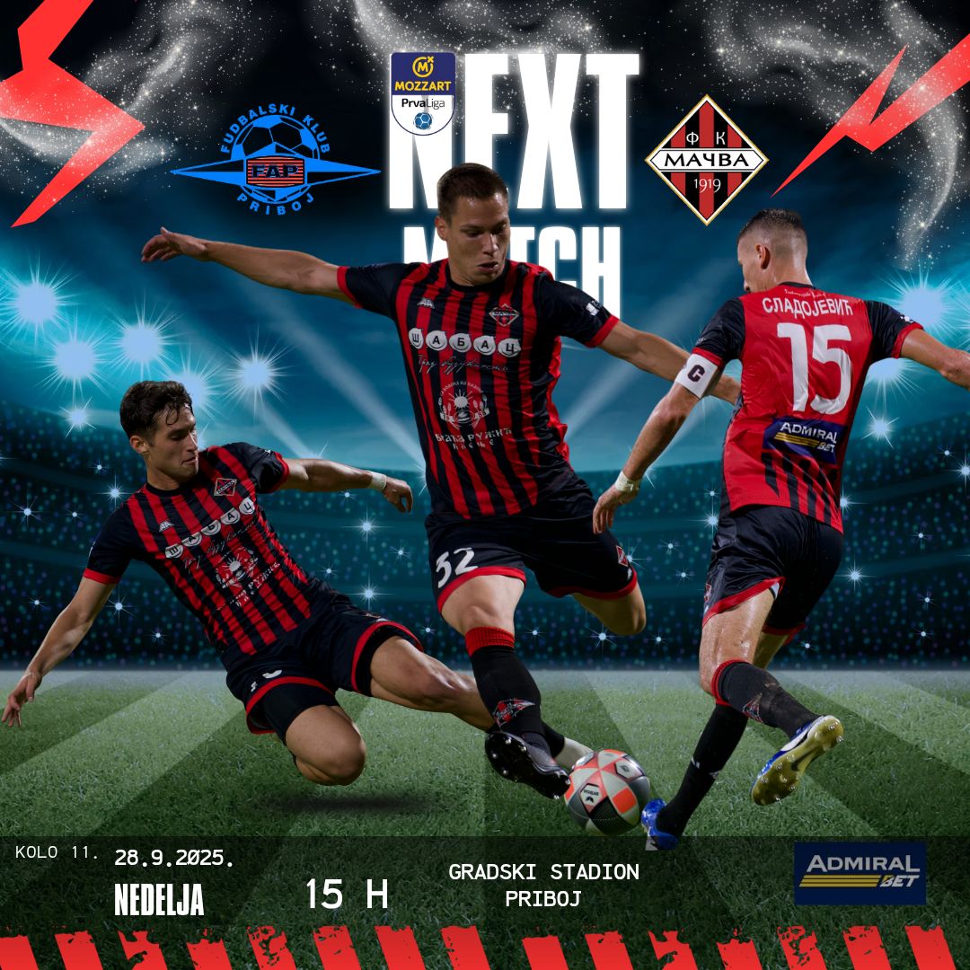 U okviru 11. kola MBPLS, fudbaleri Mačve gostuje ekipi Fap-a u Priboju. Utakmica je zakazana za nedelju 28. septembar sa početkom u 15 časova na Gradskom stadionu Priboj.
