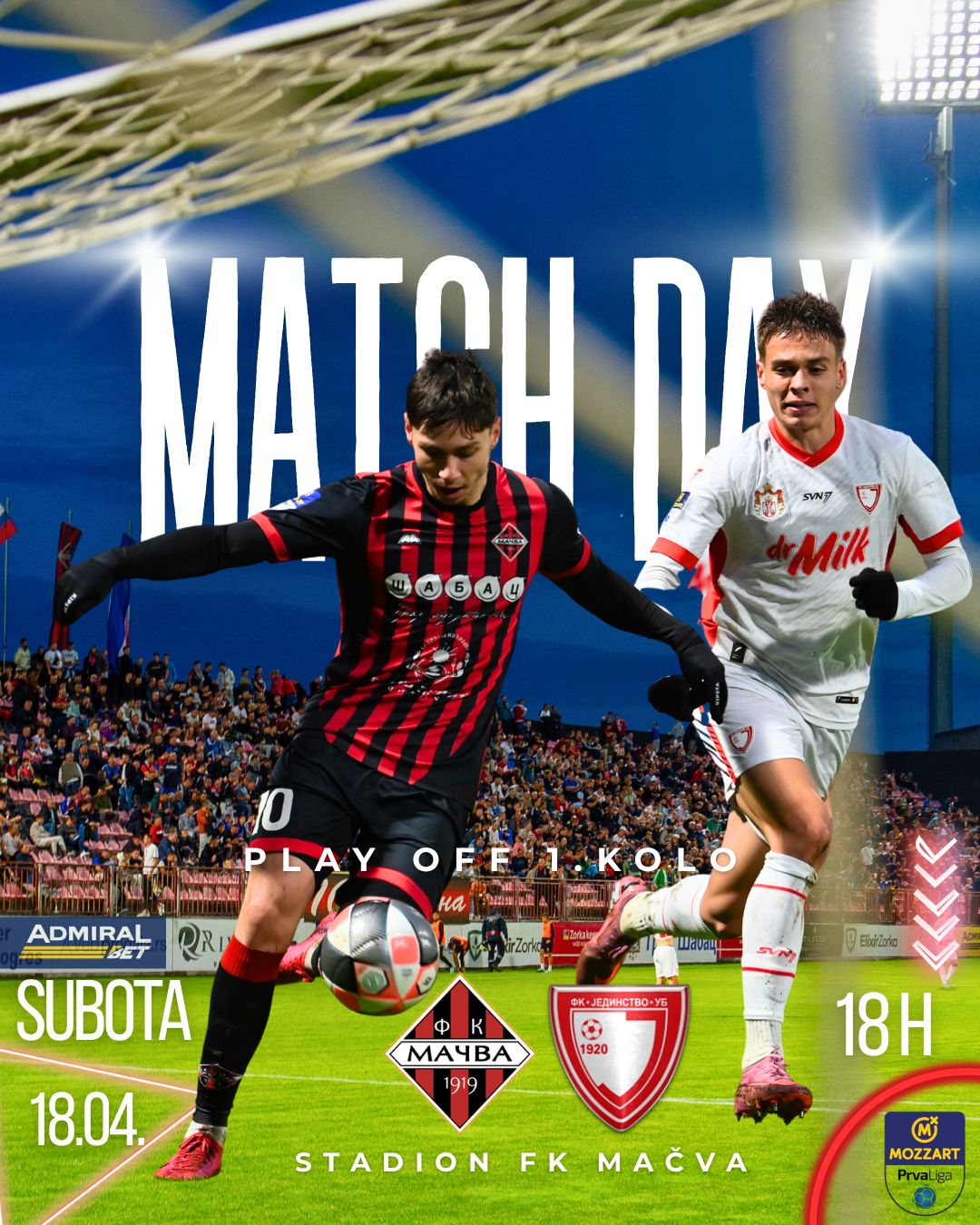 FK MAČVA – FK JEDINSTVO UB - Plej-of – 1. kolo - Subota, 18.04. - 18:00 - Stadion FK Mačva Pred nama je važan korak u borbi za plasman u Super ligu Srbije! Našim momcima je potrebna snažna podrška sa tribina kako bismo zajedno napravili prvi korak ka cilju.